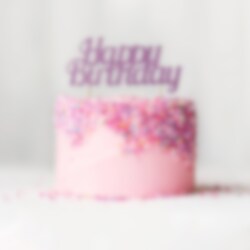 Tårtdekoration med texten "Happy Birthday" i en glittrande rosa färg. Dekorera tårtan med denna när det vankas födelsedagskalas för att göra tårtan extra tjusig. Dekorationen är ca 10 x 14 cm stor.