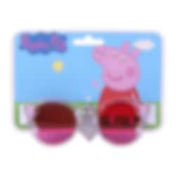 Premium solglasögon till barn i rosa färg med söta motiv och text från Peppa Pigg. På bågarna runt de rosatonade glasen finns Peppa Pig.