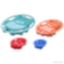 Setet inkluderar fyra olika storlekar: Daddy Pig (14 x 12,5 x 2 cm), Mummy Pig (11,5 x 10 x 2 cm), Peppa Pig (6,5 x 5,5 x 2 cm) och George Pig (4,5 x 4,5 x 2 cm), alla tillverkade av hållbar plast.
