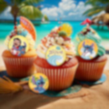 20 st. muffinsbilder av sockerpasta med söta bilder av Lilo & Stitch. De ätbara muffinsbilderna blir till fina dekorationer på cupcakes eller födelsedagstårtan. Muffinsbilderna är ca 3,4 cm i diameter och färdiga att läggas direkt på muffinsen. Bilderna förvaras torrt och svalt och är hållbara över ett år.