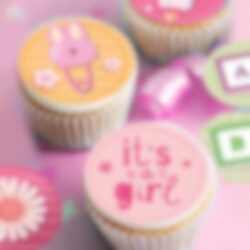 20 st. muffinsdekorationer av oblat med söta babymotiv i rosa. Perfekta att ha på muffinsen inför din babyshower. Muffinsdekorationerna är ca 4,5 cm i diameter.