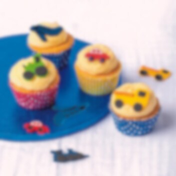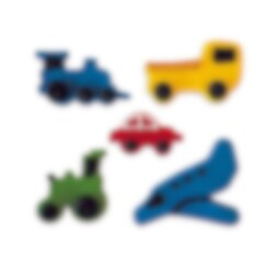 Sockerdekorationer i form av fem olika fordon: ett tåg, en traktor, en bil, en lastbil och ett flygplan. Använd dessa färggranna dekorationer för att enkelt pryda tårtor, muffins eller andra bakverk.