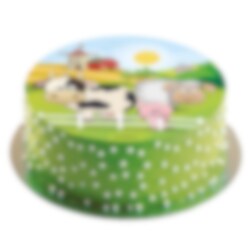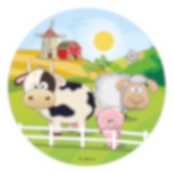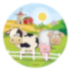 Tårtbild av oblat med motiv av söta bondgårdsdjur på sin bondgård. Baka en egen tårta till barnkalaset med bondgårdstema och placera ditt oblat på toppen. Bilden som är 20 cm i diameter är enkel att använda. Tårtbilder av oblat är glutenfria och laktosfria och har inget tillsatt socker.