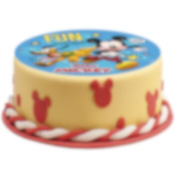 Tårtbild av god sockerfri fondant med motiv av Musse Pigg och Pluto. Tårtbilden är färdig att läggas direkt på tårtan och har ett skarpare tryck än vad en oblatbild har. Bilden är ca 15,5 cm i diameter.