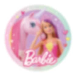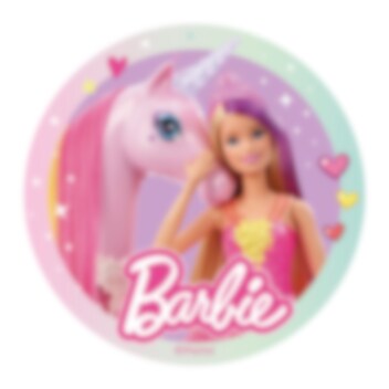 Tårtbild av oblat med motiv av Barbie tillsammans med en vacker enhörning. Baka en egen tårta till barnkalaset med Barbie som tema och placera din oblat på toppen. Bilden som är 20 cm i diameter är enkel att använda. Tårtbilder av oblat är gluten- och laktosfria och har inget tillsatt socker.