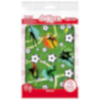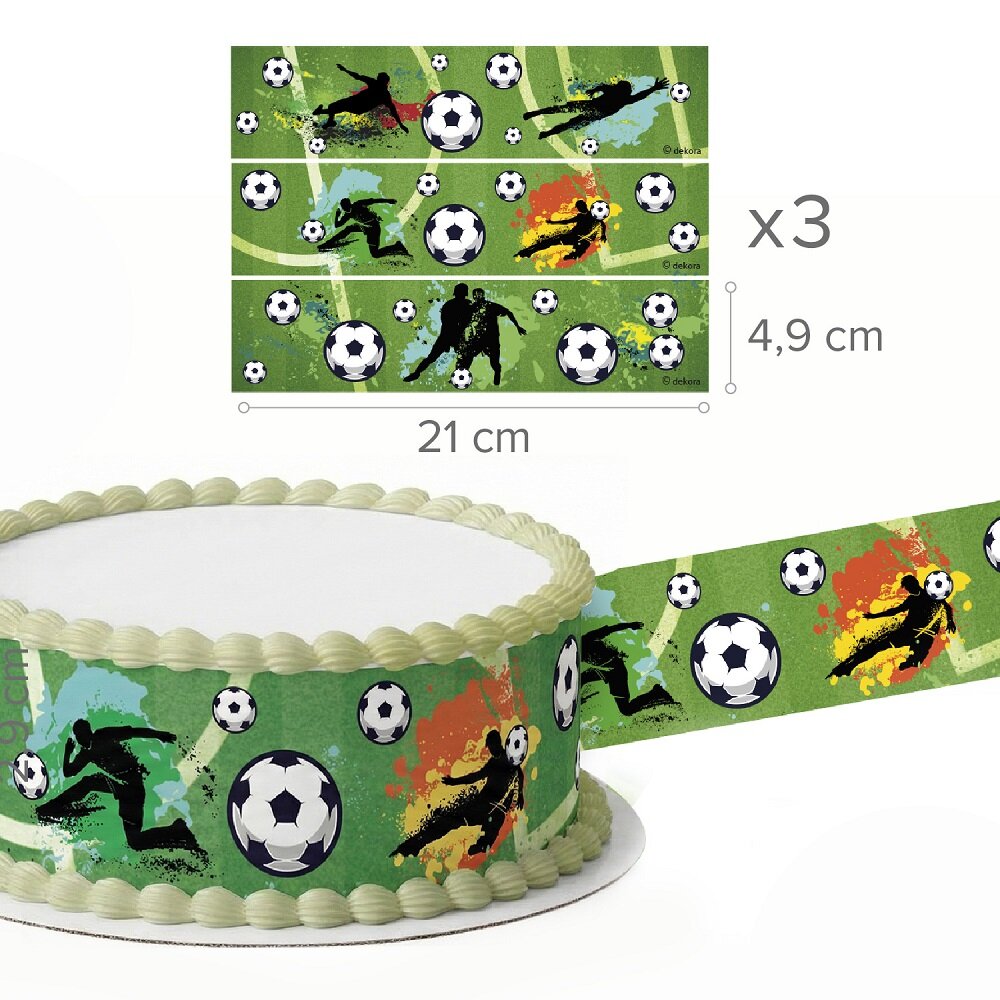 Skapa en riktigt sportig kalastårta med detta tårtdekorband i fotbollstema! Med de gröna bakgrunderna, fotbollarna och spelarsilhuetterna blir det enkelt att dekorera tårtans kant och ge tårtan en tydlig fotbollskänsla.