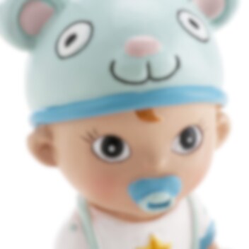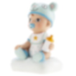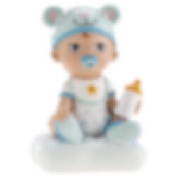 Denna söta tårtdekoration föreställer en liten bebispojke som sitter på en blå kudde och håller en nappflaska i handen. Perfekt för att dekorera tårtor vid dop, namngivning eller babyshower.
