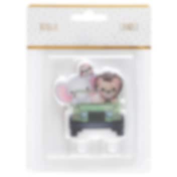 Gulligt tårtljus med motiv av safaridjur som kör en bil. Tårtljuset är ca 6,4 x 7,5 cm stort.