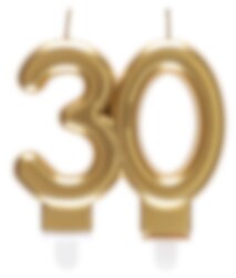 Tårtljus i guld elegant format som talet 30. Tårtljuset har en storlek om 7,5 x 9 cm.