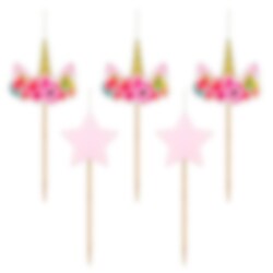 5 st. söta tårtljus med motiv av enhörningshorn och rosa stjärnor. Dessa ljusen gör sig utmärkta till ett kalas med enhörningstema. Tårtljusen är mellan 4-8 cm stora.