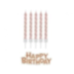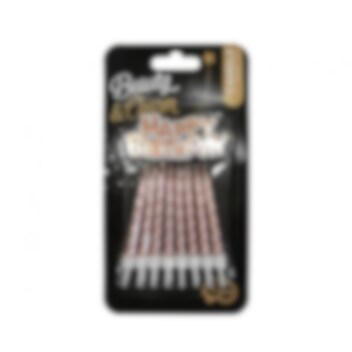 Denna uppsättning innehåller 16 stycken tårtljus i roséguld och en matchande skylt med texten Happy Birthday. Tårtljusen är 8 cm höga och är perfekta för att lägga till en stämningsfull elegans på tårtan och gör firandet ännu mer minnesvärt.