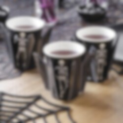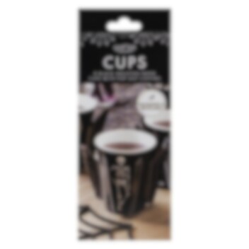 8 st. svarta pappmuggar med coolt motiv av ett skelett som ligger i en 3D kista. Muggarna är 10 cm höga och rymmer 250 ml.