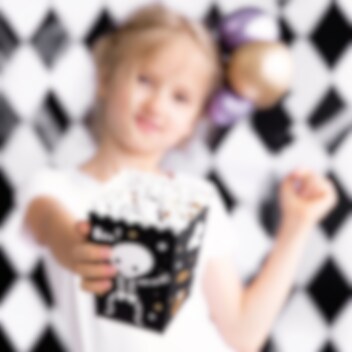 6 st. popcornboxar med ordet "BOO!". De är 7 x 12,5 cm stora, vilket gör dem perfekta för att servera popcorn eller andra snacks i till Halloween.