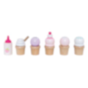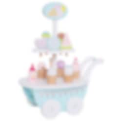 Glassvagn med tillhörande glassar i pastellfärger, allt är tillverkat av trä. En rolig leksak från Jabadabado att ge till barnet som ska döpas eller fyller år. Förpackningen inkluderar 1 glassvagn på hjul, 5 st. kul/mjukglassar, 5 st. pinnglassar, 1 glasskopa och 1 flaska med jordgubbstopping. Kulglassarna och mjukglassarna är avtagbara så att du själv kan bygga din glass. Glassvagnen är 31x18x40 cm stor.