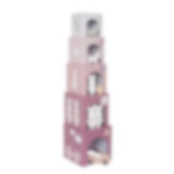 Ett set med 5 st. färgglada stapelbara kuber tillverkade i hård papp som är numrerade med siffrorna 1-5 och har två olika fina motiv på vardera sida. Det följer även med små träfigurer så som en bil, hund, katt, teddybjörn och kaniner.
