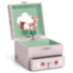 En vackert dekorerat kombinerad smyckeskrin och speldosa där en söt rådjurskid dansar till en melodi när någon öppnar locket. Det snygga smyckeskrinet har en liten låda för smycken eller hemligheter samt ett fack under locket som är inklätt med sammet för att skydda dina smycken.