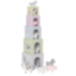 Stapelkuber i härliga färger med tillhörande bondgårdsdjur från Jabadabado. Kuberna och djuren är gjorda av hård papp och varje kub har ett eget motiv samt en siffra mellan 1-5. En rolig doppresent som inte bara blir kul att leka med utan också hjälper barnet att lära sig räkna. Den största kuben har siffran 5 och är 12 cm stor.