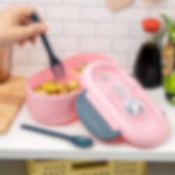 Matlådan är tillverkad i slitstark plast och har en smart avdelare som håller maten på plats. Den levereras med ett eget bestickset, både sked och gaffel i plast ingår, och locket är dekorerat med klassiska Hello Kitty-karaktärer.