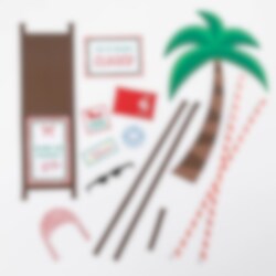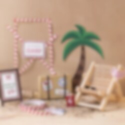 ✔️ Innehåller strandstol, palm, skyltar, resväska och dekorationer