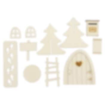 1 dörr, 1 brevlåda, 1 stege, 2 granar, 1 skylt, 2 fönster, 1 platta med fotsteg, 1 rund skiva samt 1 ark med klistermärken till skylten.