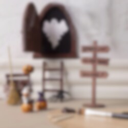 Måla skylten med Plus Color-hobbyfärg och skriv sedan ner destinationer med en tunn Plus Color-tuschpenna så att skylten kan visa vägen i det nissarnas miniatyrland.