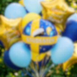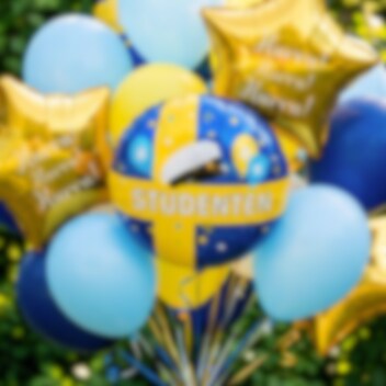 Skapa en festlig studentdekoration med denna runda folieballong i blått och gult. Med texten "Studenten", motiv av studentmössa, ballonger och konfetti blir den ett riktigt fint blickfång till utspring, mottagning och studentfest.