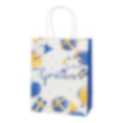 Ge bort studentpresenten i en festlig presentpåse som passar perfekt till den stora dagen. Denna fina påse i blått, gult och vitt med ballonger, serpentiner, Sverigeflaggor och texten "Grattis" gör gåvan extra rolig att ge bort och bidrar samtidigt till den härliga känslan runt studentfirandet.