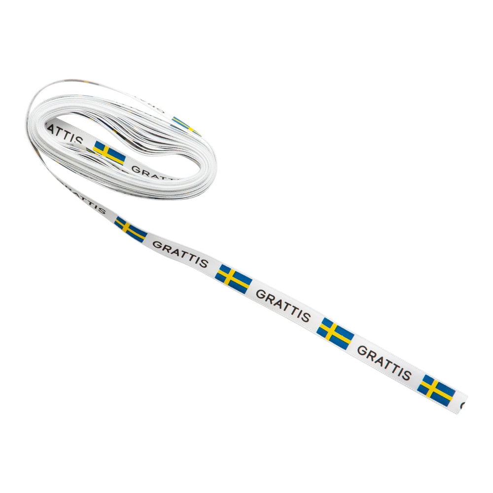 Ge presenter och dekorationer en festlig touch med detta sidenband med texten Grattis och svenska flaggor. Det passar perfekt till studenten, men också till födelsedagar och andra tillfällen där du vill göra presentinslagningen eller dekorationerna lite extra fina.
