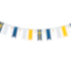 Skapa en festlig inramning till studentfirandet med denna dekorativa girlang i blått, gult och vitt. Med en mix av flaggor, svenska flaggor, prickiga detaljer och champagneglas blir den ett fint blickfång som passar perfekt till studentmottagning, utspring och firande hemma.
