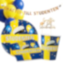 Fixa studentfirandet enkelt med detta festliga studentkit för 12 personer. Kitet innehåller matchande dukning, dekorationer och en ballongmix i blått och gult som snabbt skapar en härlig feststämning till studentmottagning, fika eller firande hemma. Med allt samlat i ett paket blir det lätt att ordna en snygg och genomtänkt helhet inför den stora dagen.