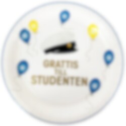 Duka fram något gott till studentfirandet med dessa festliga tallrikar i vitt, blått och guld. Med motiv av studentmössa, ballonger och texten "Grattis till Studenten" blir de ett fint inslag på bordet och passar perfekt till både studentmottagning och firande hemma.