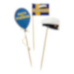 Dekorationerna sitter på pinnar och är enkla att placera i tårta, cupcakes, bakelser eller annan studentfika när du vill skapa en snygg och genomtänkt dukning med liten insats.
