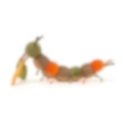 En kul aktivitetsleksak i form av en larv i grönt, brunt och orange med en ring i munnen där två löv hänger. Med pipande, prasslande och skallrande ljud att upptäcka och olika strukturer och material att känna på kan den ge timmar av utforskande. Med hjälp av ringen kan ni fästa leksaken i till exempel vagnen eller spjälsängen.