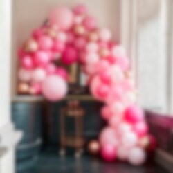 Riktigt pampig ballongbåge i rosa- och roséguldfärgade toner som du själv bygger ihop. En verkligt imponerande dekoration som passar både till kalas, fester eller bröllop. Förpackningen innehåller hela 200 st. ballonger i olika storlekar och tillbehör. Ballongbågen är ca 12 meter lång.