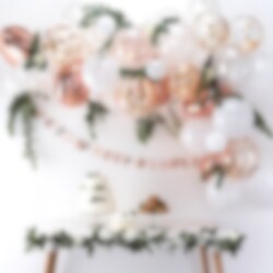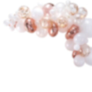 Mäktig ballongbåge i roséguld- och vitfärgade toner som du själv bygger ihop. En verkligt imponerande dekoration som passar både till kalas, fester eller bröllop. Förpackningen innehåller hela 70 st. ballonger i olika storlekar och tillbehör. Ballongbågen är ca 4 meter lång.