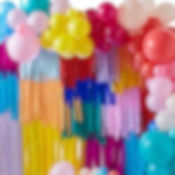 Tjusig ballongbåge i regnbågsfärgade toner med tillhörande streamers som du själv bygger ihop. Den ultimata dekorationen att ha på kalaset eller festen för att imponera på gästerna. Förpackningen innehåller hela 115 st. ballonger i olika storlekar och tillbehör. Ballongbågen är ca 12 meter lång.