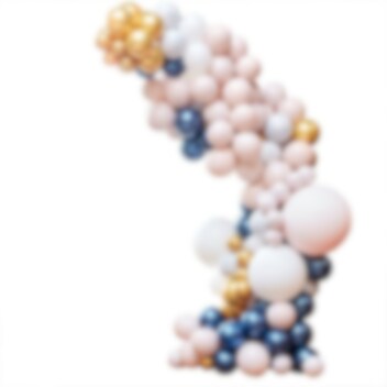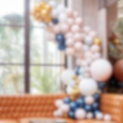 Lyxig ballongbåge i blå-, guld-, puderrosa- och vitfärgade toner som du själv bygger ihop. Gör kalaset, festen eller bröllopet lite mer exklusiv med hjälp av detta kit. Förpackningen innehåller hela 200 st. ballonger i olika storlekar och tillbehör. Ballongbågen är ca 12 meter lång.