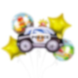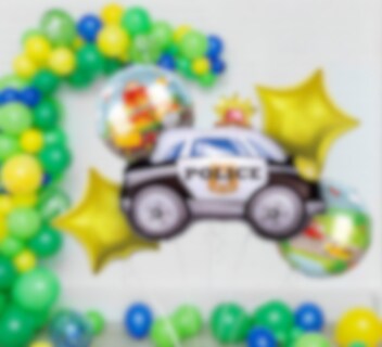 Rolig ballongbukett med olika folieballonger i polistema. Buketten består av en stor polisbil, 70 cm, två runda ballonger med motiv av fordon, 35 cm och två stjärnformade ballonger i guld, 35 cm. Förutom ballongerna så ingår vitt ballongsnöre.