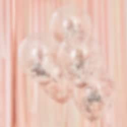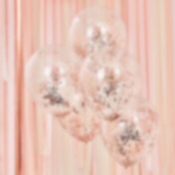 5 st. snygga genomskinliga ballonger fyllda med glittrig roséguldkonfetti. Ballongerna kan blåsas upp med luft eller med helium och blir ca 30 cm i diameter uppblåsta.