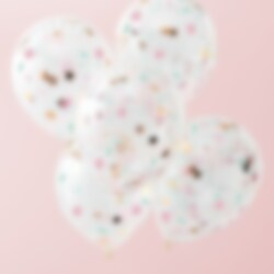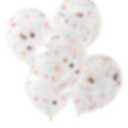 5 st. ballonger fyllda med blomformad konfetti i blommönster och roséguld färg. En fin dekoration till kalaset, festen eller babyshowern. Ballongerna blir ca 30 cm i diameter uppblåsta.