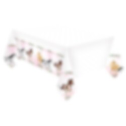 Fin bordsduk av plast i rosa färger och med motiv av vackra hästar bland blommor. Ett tjusigt dukningskomplement till ditt kalas med hästtema.