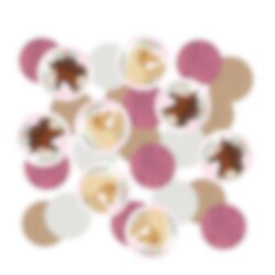 Förpackning med papperskonfetti i rosa och vita färger samt med motiv av hästar. En tjusig dekoration att strö över bordet inför kalaset med hästtema.