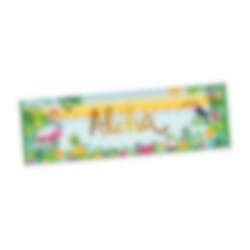 Skapa en riktigt härlig tropisk festkänsla med denna stora dekorationsbanner i tyg med Aloha-motiv. Den färgstarka designen med flamingo, tukan, blommor, palmblad, ananas, kokosnöt och vattenmelon gör den till ett perfekt blickfång på sommarfest, hawaiikalas, poolparty eller andra festliga tillfällen med tropiskt tema.