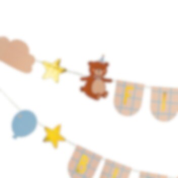 Tjusig girlang med texten "First Birthday" och motiv av björnar, stjärnor, moln och himmel i glada färger. Denna fina dekoration är perfekt för att skapa en rolig stämning på 1-årskalaset med teddybjörntema.