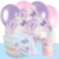 Detta färdiga kalaspaket med söta tillbehör i fjärilstema inkluderar tallrikar (23 cm), pappmuggar (250 ml) och servetter (33 x 33 cm) för 8 eller 16 personer, utöver det så ingår 10 st. rosa ballonger och 10 st. lila ballonger och en ljusblå bordsduk av plast (137 x 274 cm).