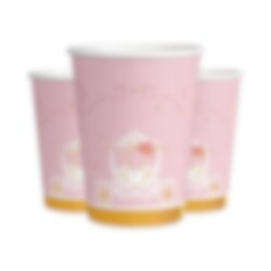 8 st. pappmuggar med motiv av prinsessvagnar med guldfolierade detaljer framför en ljusrosa bakgrund från temat Princess for a Day. Muggarna är ca 9 cm höga och rymmer ca 250 ml.