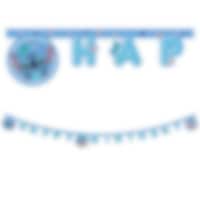 Härlig girlang av papp i blått med texten "Happy Birthday" och fina motiv från Lilo & Stitch. Girlangen är 2 meter lång.