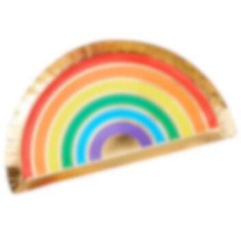 8 st. vackra regnbågsformade tallrikar med guldfolierade kanter och med motiv av en regnbåge. Tallrikarna är tillverkade av papper och är ca 27 x 16 cm stora.