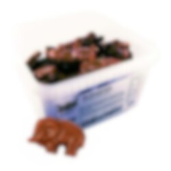 Chokladöverdragna elefanter med jordgubbsskum inuti. De säljs i en storpack på 1 100 gram.