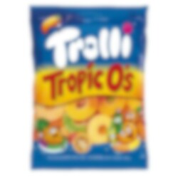 Syrliga sockrade gelégodisar som är formade som ringar med olika tropiska fruktsmaker. Vikt 100 gram.